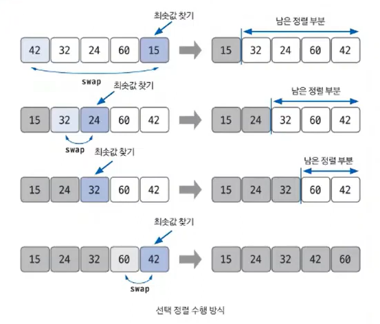 ① 남은 정렬 부분에서 최솟값(=오름차순 정렬) 또는 최댓값(=내림차순 정렬) 찾기