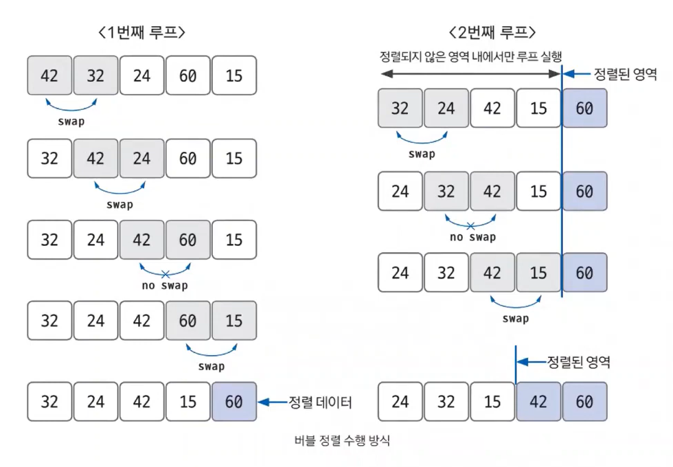 - 루프를 돌면서 인접한 데이터 간의 swap 연산으로 데이터 정렬
