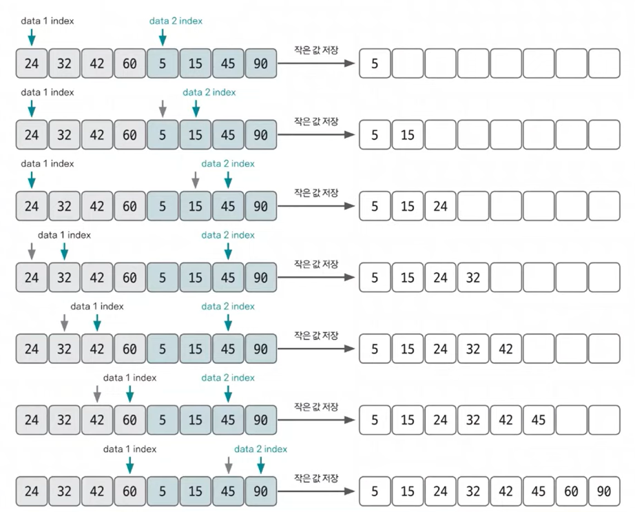 투 포인터 개념을 사용하여 왼쪽 그룹 포인터와 오른쪽 그룹 포인터의 값을 비교하여 작은 값을 결과 배열에 추가하고 포인터를 오른쪽으로 1칸 이동