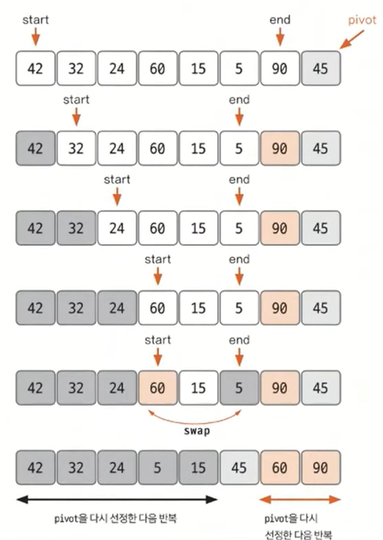 - start가 가리키는 데이터가 pivot이 가리키는 데이터보다 크고, end가 가리키는 데이터가 pivot이 가리키는 데이터보다 작으면 start, end가 가리키는 데이터를 swap 하고 start는 오른쪽, end는 왼쪽으로 1칸씩 이동
