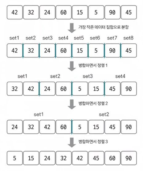 ② 데이터 집합을 2개씩 합치며 오름차순 정렬하는 과정을 반복