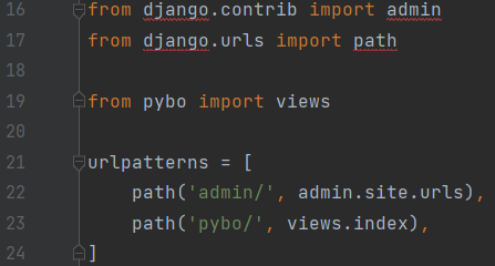pybo 앱을 실행하기 위해 urls.py에서 urlpatterns에 다음과 같은 코드를 추가하였다.
