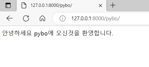 이렇게 작성한 후 브라우저에서 다시 pybo를 호출하면 아래 사진처럼 HttpResponse에 작성한 문장이 출력되는 것을 볼 수 있다.