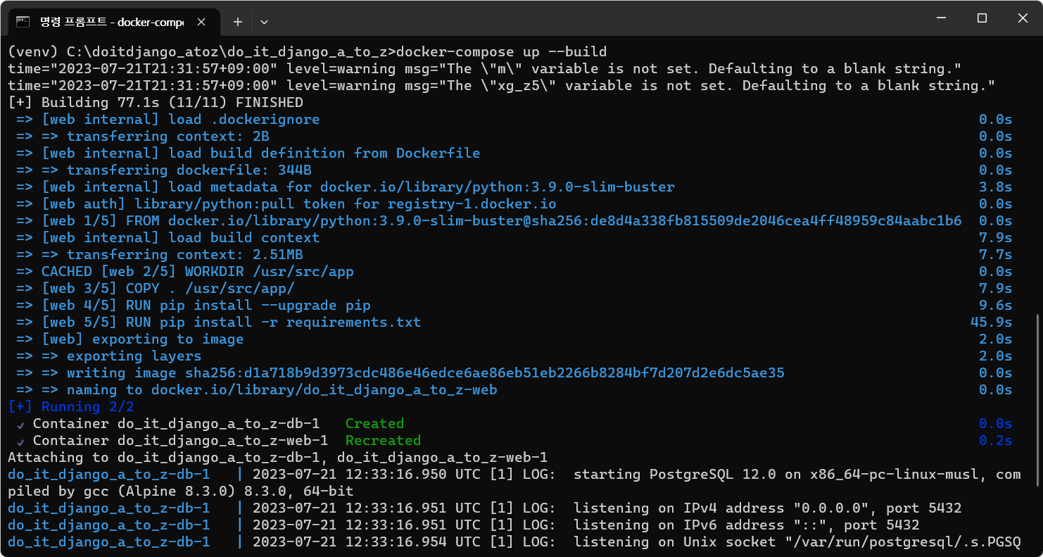 따라서, Docker Desktop을 실행시킨 뒤 다시 도커 명령어를 입력하면 정상적으로 진행되는 것을 볼 수 있다.