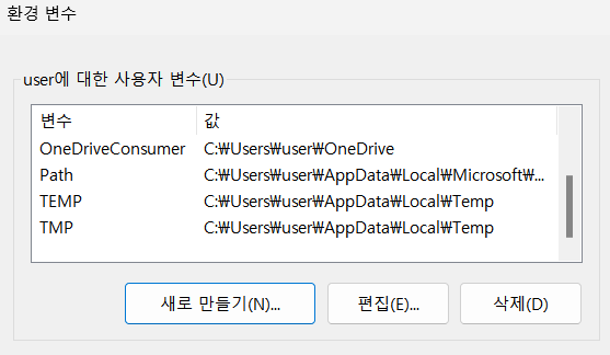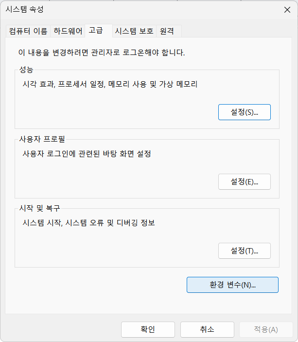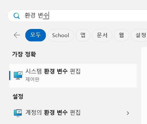 Next를 눌러 설치하고 나면 환경 변수를 설정해주어야 한다. 시작메뉴에서 환경 변수를 검색하면 바로 찾을 수 있다.