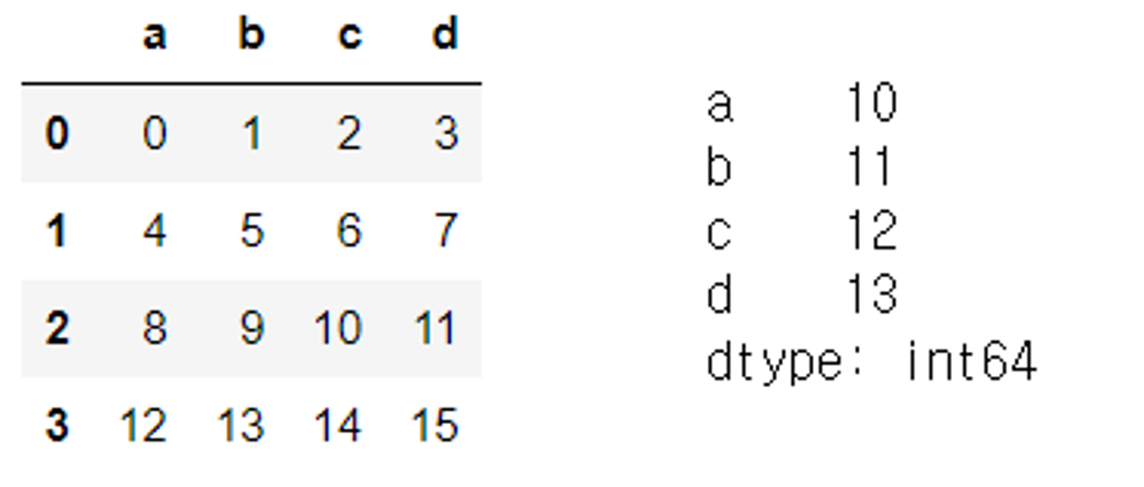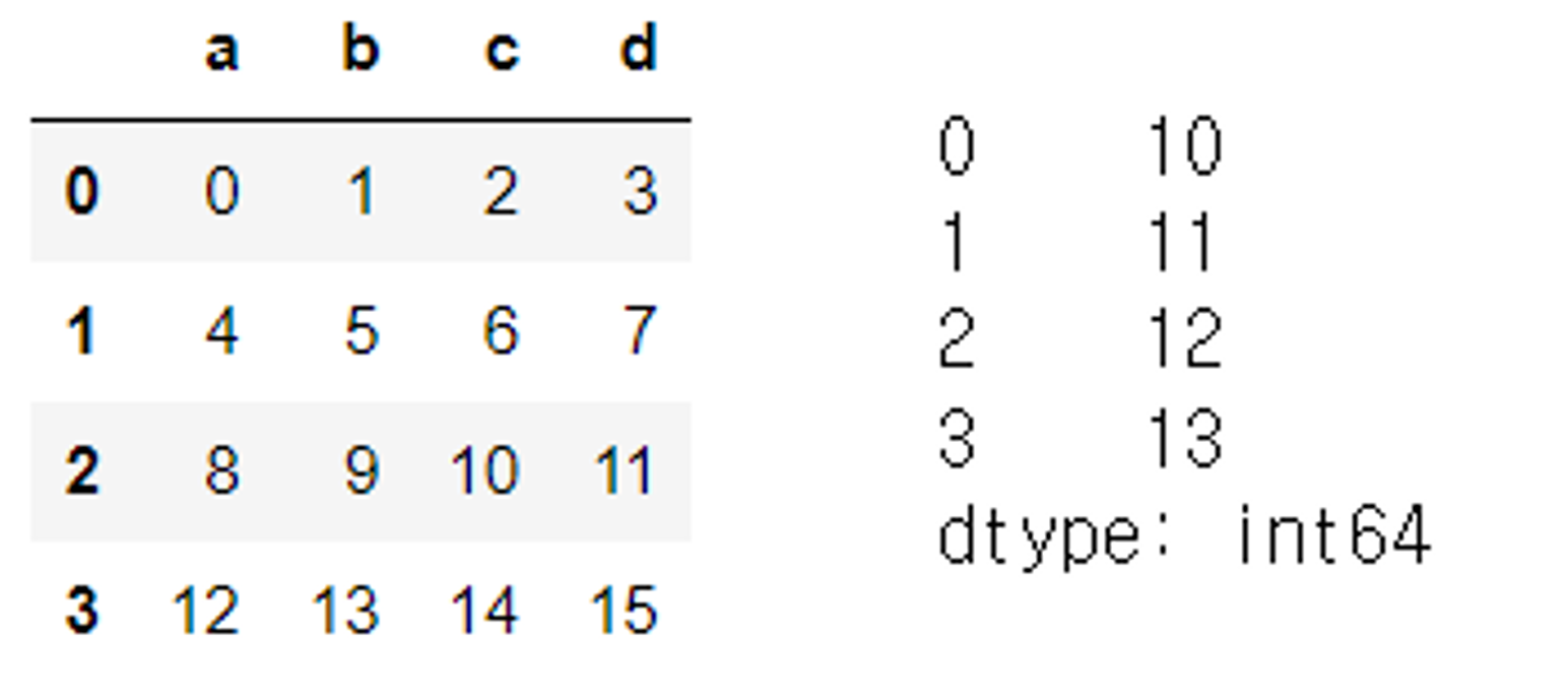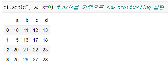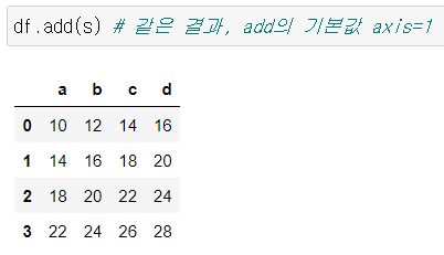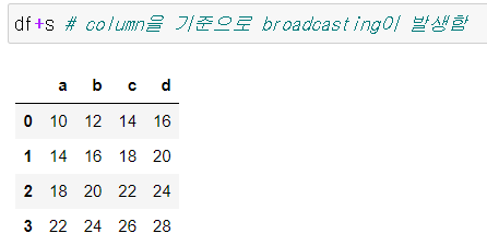 즉, s에서 인덱스 a에 해당하는 값인 10을 df의 a열에 한 번에 더한다.
