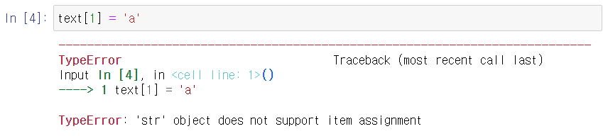 즉, TypeError: 'str' object does not support item assignment = 문자열에서는 아이템 배치를 지원하지 않는다.