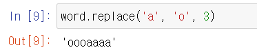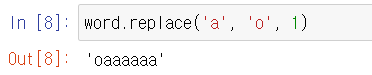 'aaaaaaa'에서 'a'를 'o'로 바꾸려고 한다. 이때 word.replace('a', 'o')로 작성해주면 모든 'a'를 'o'로 바꾼다.