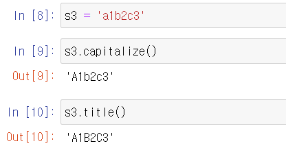 capitalize() 함수는 전체 문자열의 맨 앞 글자만 대문자로 바꾸었고, title() 함수는 숫자, 특수문자를 기준으로 문자열을 구분하여 각 문자열의 맨 앞글자를 대문자로 바꾸었다.