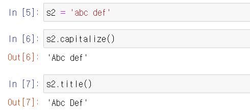 s2='abc def'와 같이 공백이 있는 경우의 capitalize()와 title() 함수 적용 결과는 다음과 같다.